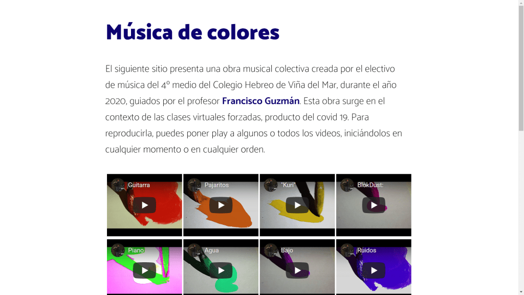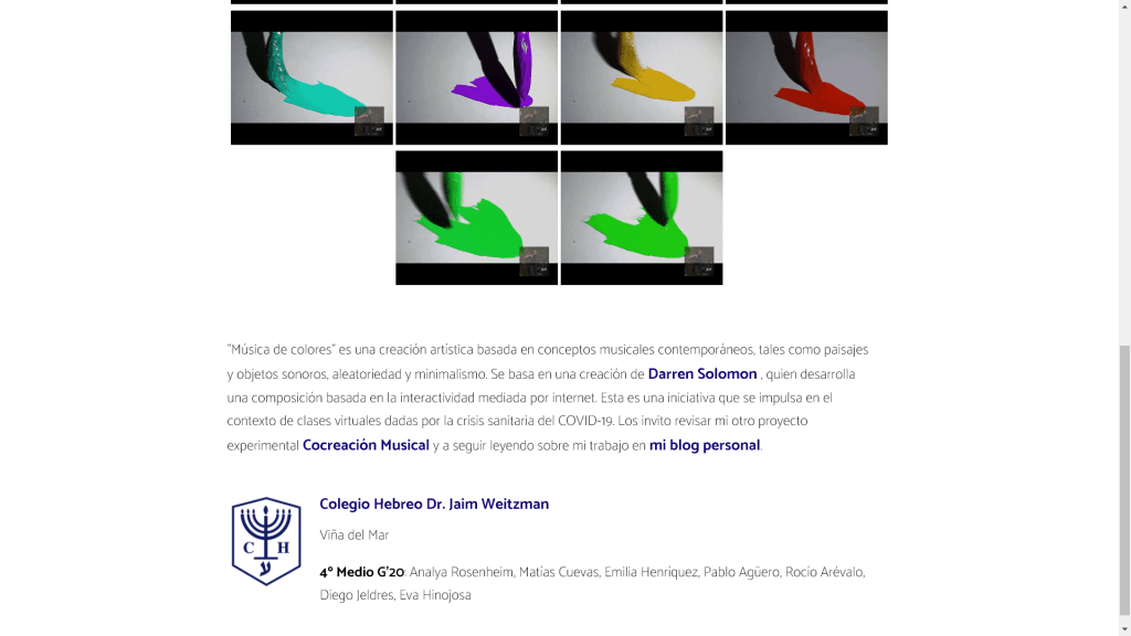 Tuve el orgullo de realizar una presentación artística como no había tenido la oportunidad de hacer antes. La pandemia ha dado vuelta nuestras vidas y realizar clases de música en modo online me llevo a buscar nuevos caminos para no dejar de generar un aprendizaje significativo a través de mi arte. En esa incertidumbre es que me propuse buscar un mecanismo a través del cual pudiera vincular el trabajo creativo que normalmente desarrollo con mis alumnos de cuarto medio; con algún elemento tecnológico que nos permitiera desarrollar una obra colectiva e interactiva. Estas dos palabras han circundado buena parte de mi trabajo creativo y basándome en la obra «in Bb 2.0» del artista Darren Solomon; quien utiliza un sistema web para generar una obra interactiva basada en la superposición de videos pregrabados que se reproducen de forma aleatoria por el visitante. Esta idea es la base de lo que desarrollamos junto a mis alumnos; quienes a pesar del contexto COVID-19; demostraron ser capaces de apropiarse de conceptos sonoros contemporáneos desde la practica creativa. El resultado es esta composición musical creada en conjunto con mis alumnos y que además incorpora muchos elementos de música contemporánea que fueron trabajados por ellos desde la experimentación.